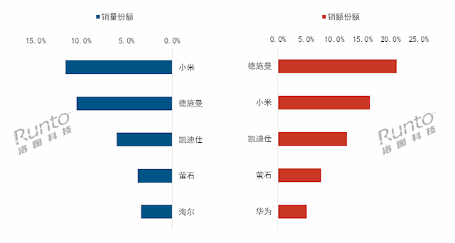 德施曼在整体全渠道市场中位列销量份额第二,但销售额是第一名。