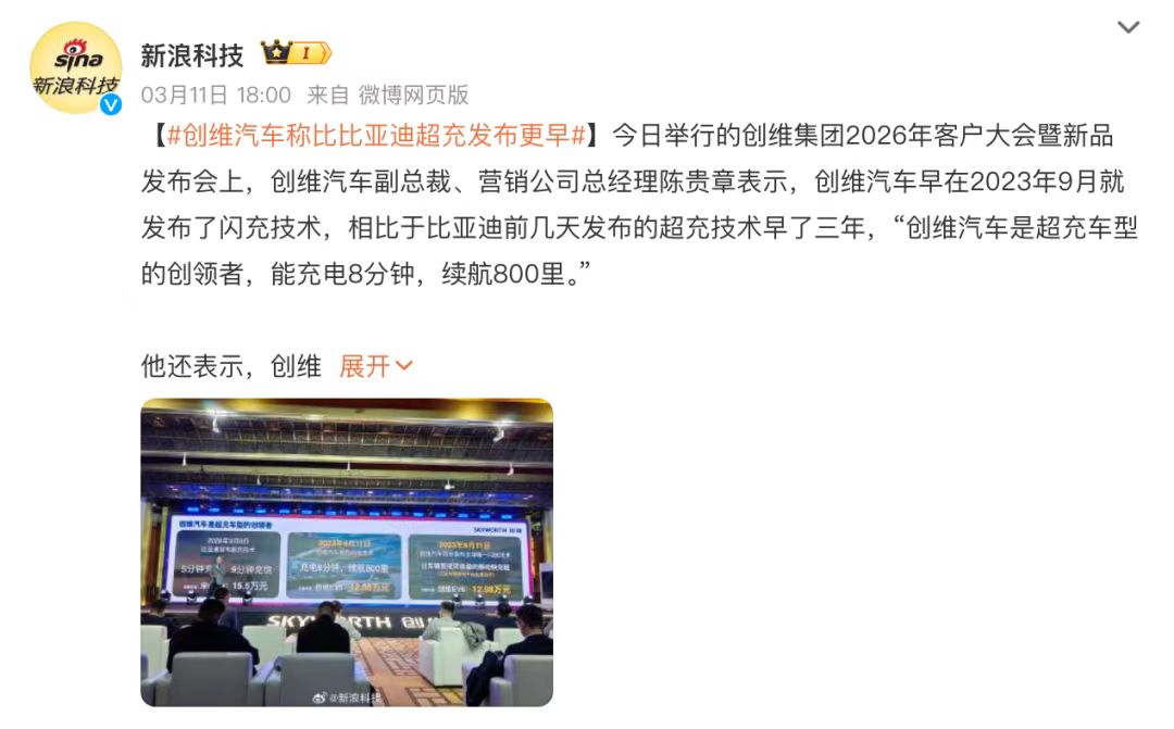 3月11日,在创维集团2026年客户大会暨新品发布会上,创维汽车副总裁、营销公司总经理陈贵章公开表示:创维汽车早在2023年9月就发布了闪充技术,比比亚迪这次发布的超充技术整整早了三年。他还高调宣称“创维汽车是超充车型的创领者”,能做到充电8分钟,续航800里。这话一出,网友直接炸锅了。