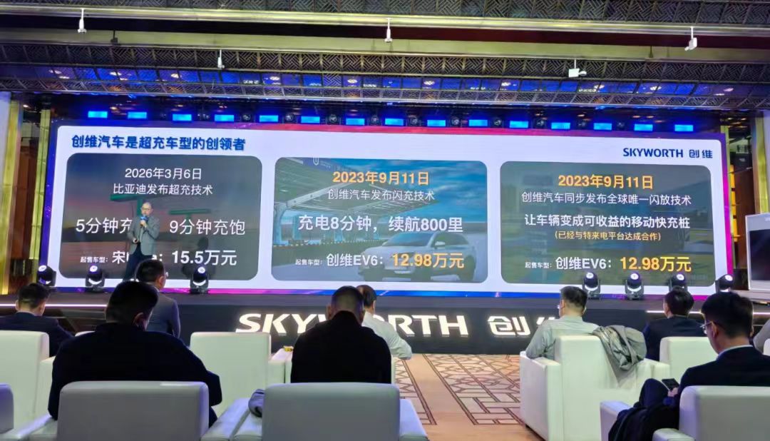 创维的发言可以概括为三点。一是时间上占先。 创维汽车副总裁陈贵章公开表示,创维早在2023年9月就发布了闪充技术,比比亚迪2026年3月发布的超充技术早了整整三年,因此宣称“创维是超充车型的创领者”。